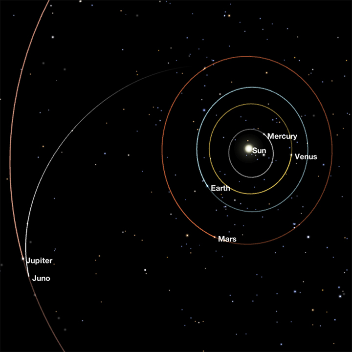Juno is slated to arrive at the gas giant planet on July 4, 2016, at 8:35 p.m. PDT (Earth Received Time). Track and visualize Juno’s journey through space using NASA's Eyes on the Solar System 3D interactive.