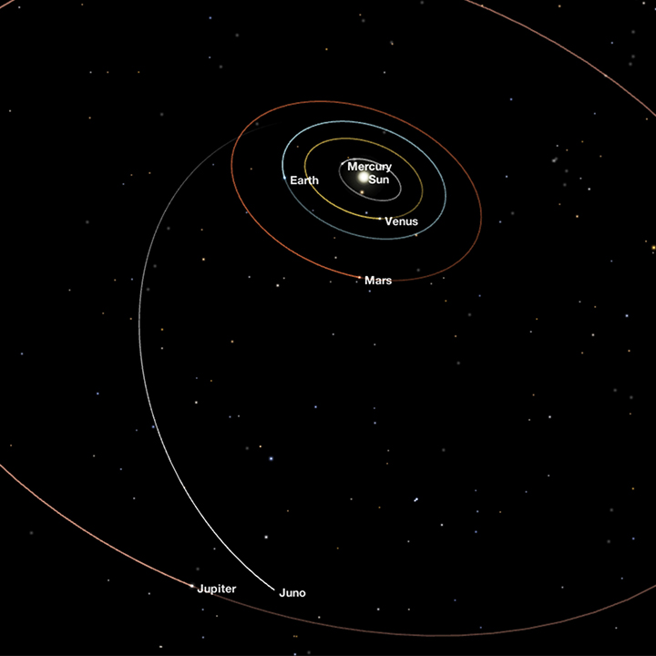 Juno is slated to arrive at the gas giant planet on July 4, 2016 (scheduled for 7:47 p.m. Pacific Time). Visualize Juno’s journey through space and get up-to-date data sets using NASA's Eyes on the Solar System 3D interactive.