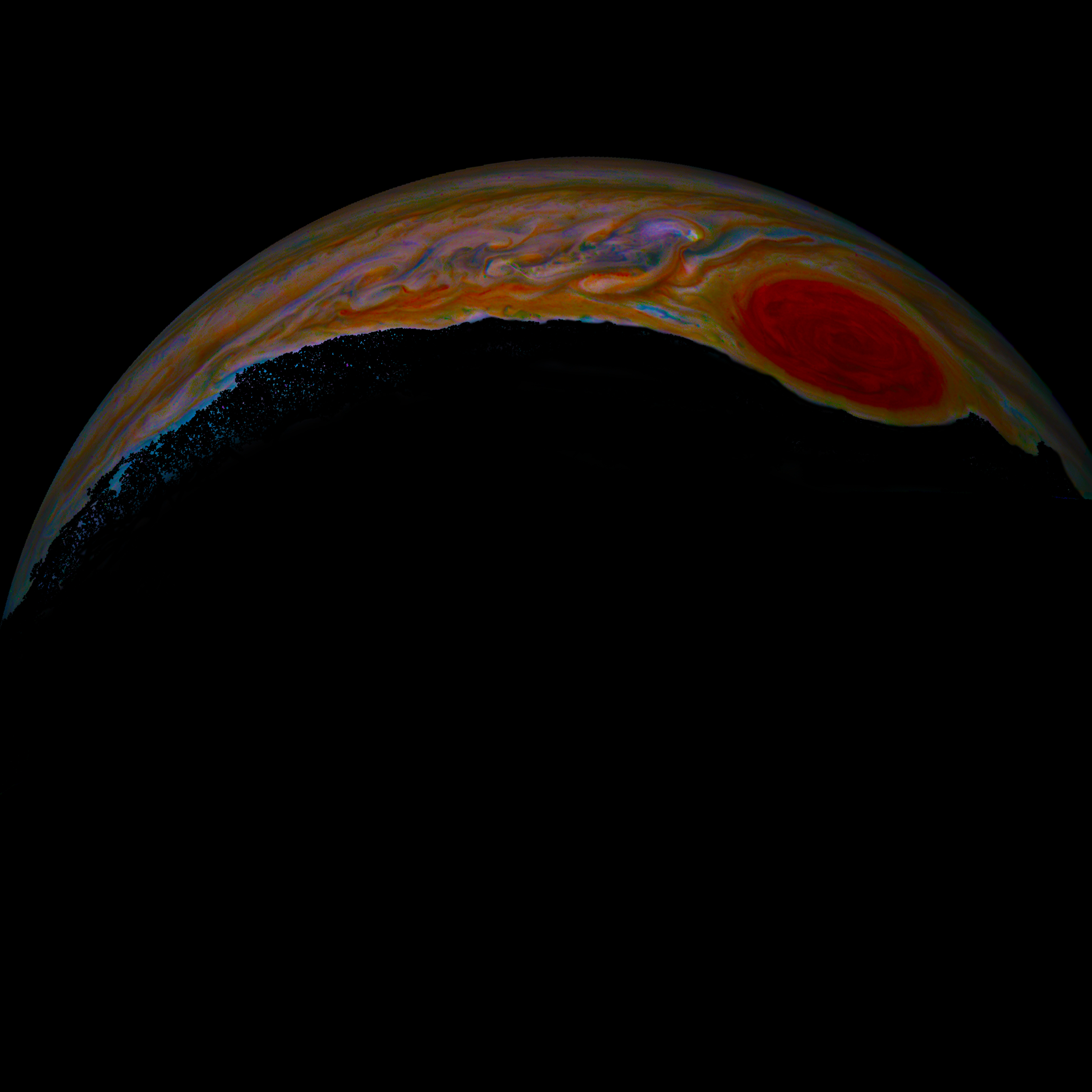 Jupiter’s already vibrant colors become especially striking in this artistic interpretation of an image from NASA’s Juno mission that shows the planet’s famous Great Red Spot. Citizen scientist Mary J. Murphy processed an image from the spacecraft’s JunoCam instrument, increasing the color saturation to create a piece Murphy calls “The Rose.”