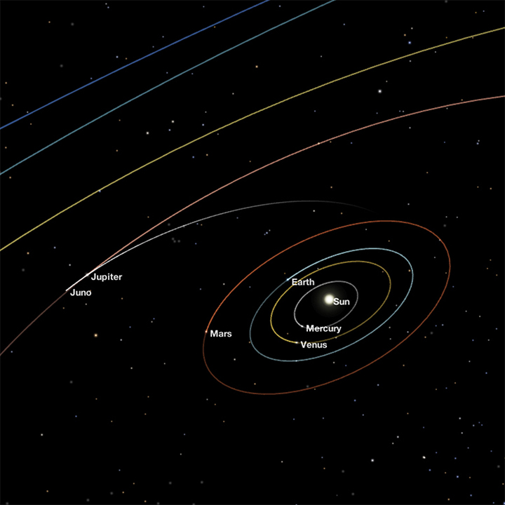 Juno is slated to arrive at the gas giant planet on July 4, 2016, scheduled for 8:35 p.m. PDT (Earth Received Time). Visualize Juno’s journey through space and get up-to-date data sets using NASA's Eyes on the Solar System 3D interactive.