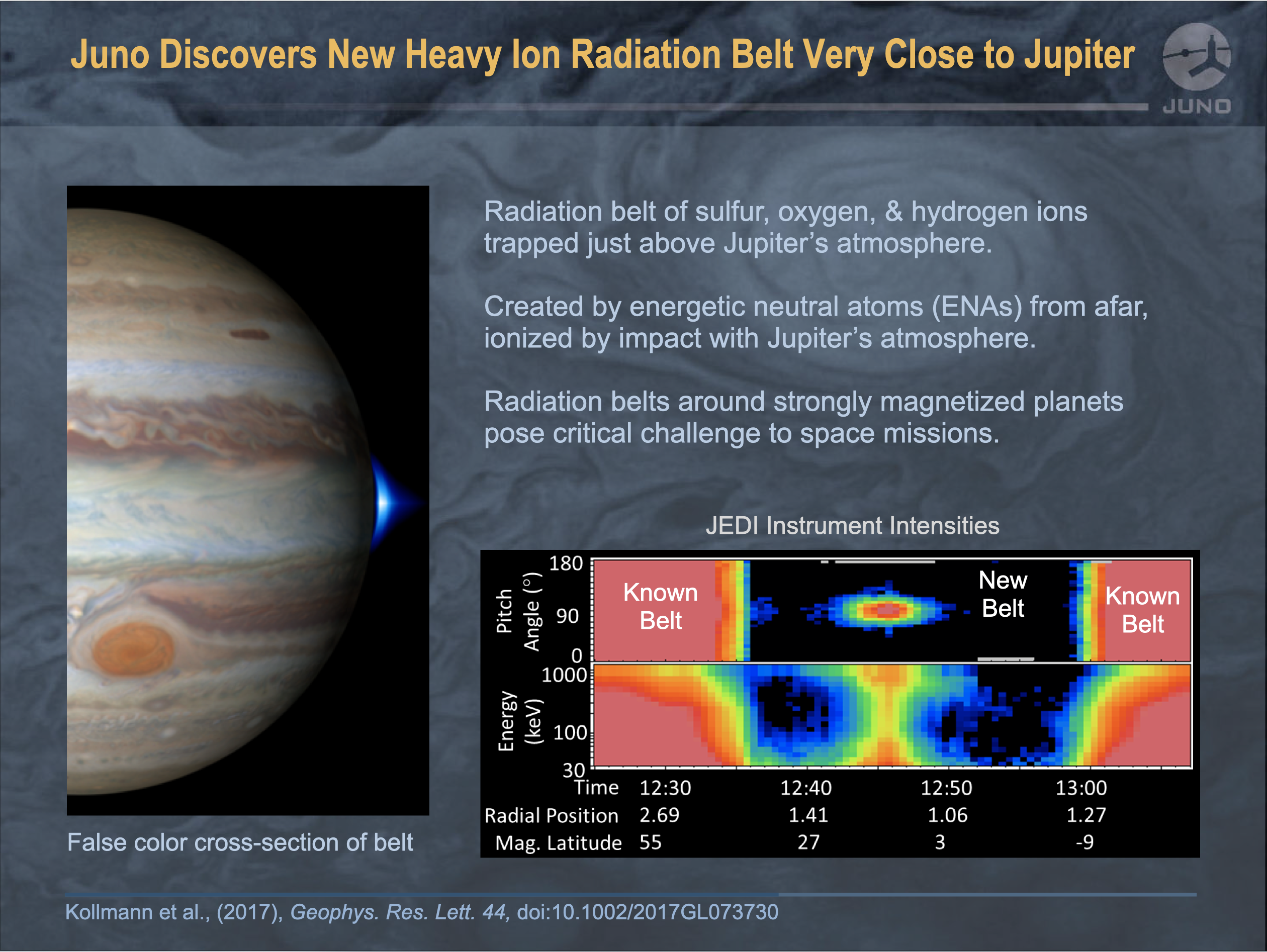 Unlike particles observed by Galileo Probe 20 years ago, Juno discovered a new radiation belt resting just above Jupiter’s atmosphere. The new belt is comprised of high-energy sulfur, oxygen, and hydrogen ions that are thought to be created by neutral atoms originating afar becoming ionized when they hit Jupiter’s atmosphere.